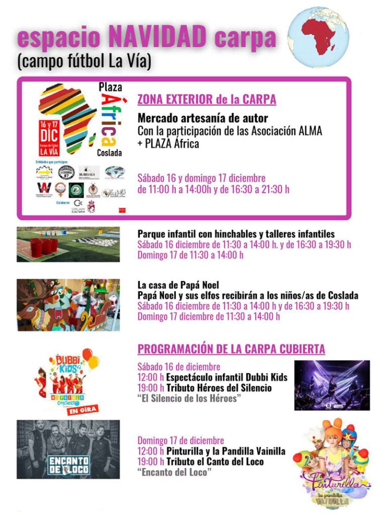 Este fin de semana llega el espacio Navidad carpa al campo de fútbol La Vía, con conciertos, plaza África, la casa de Papa Noel, preúvas y espectáculos infantiles.