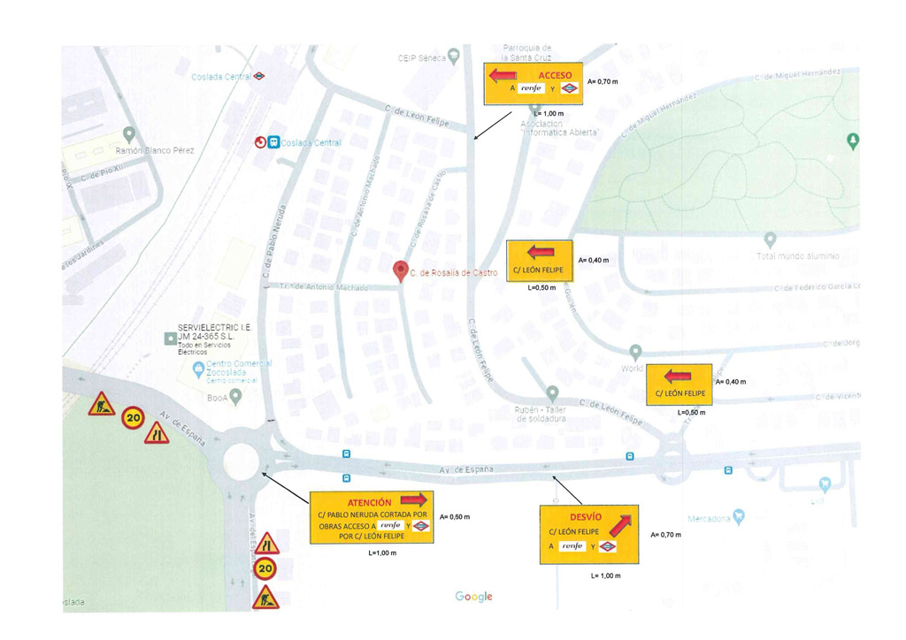 Como recorrido alternativo a dicha calle, conforme se muestra en el plano explicativo, se circulará por la Avenida de España hasta la glorieta partida, donde se efectuará un cambio de dirección hacía la calle León Felipe, continuando por la misma hasta la Travesía del mismo nombre, desde donde se puede acceder al estacionamiento de Coslada Central.