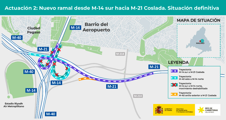 Antes de esta intervención, los conductores que se incorporaban desde la M-14 sentido sur hacia la M-21 con dirección a Coslada tenían que realizar un trenzado de corta longitud, lo que dificultaba una circulación fluida y segura. Ahora, gracias a la ejecución de un vial independiente, este movimiento se realiza de forma mucho más eficiente. El nuevo ramal permite seguir por un carril propio hasta la incorporación definitiva a la M-21, justo después del paso sobre la calle de Campezo (M-214).
