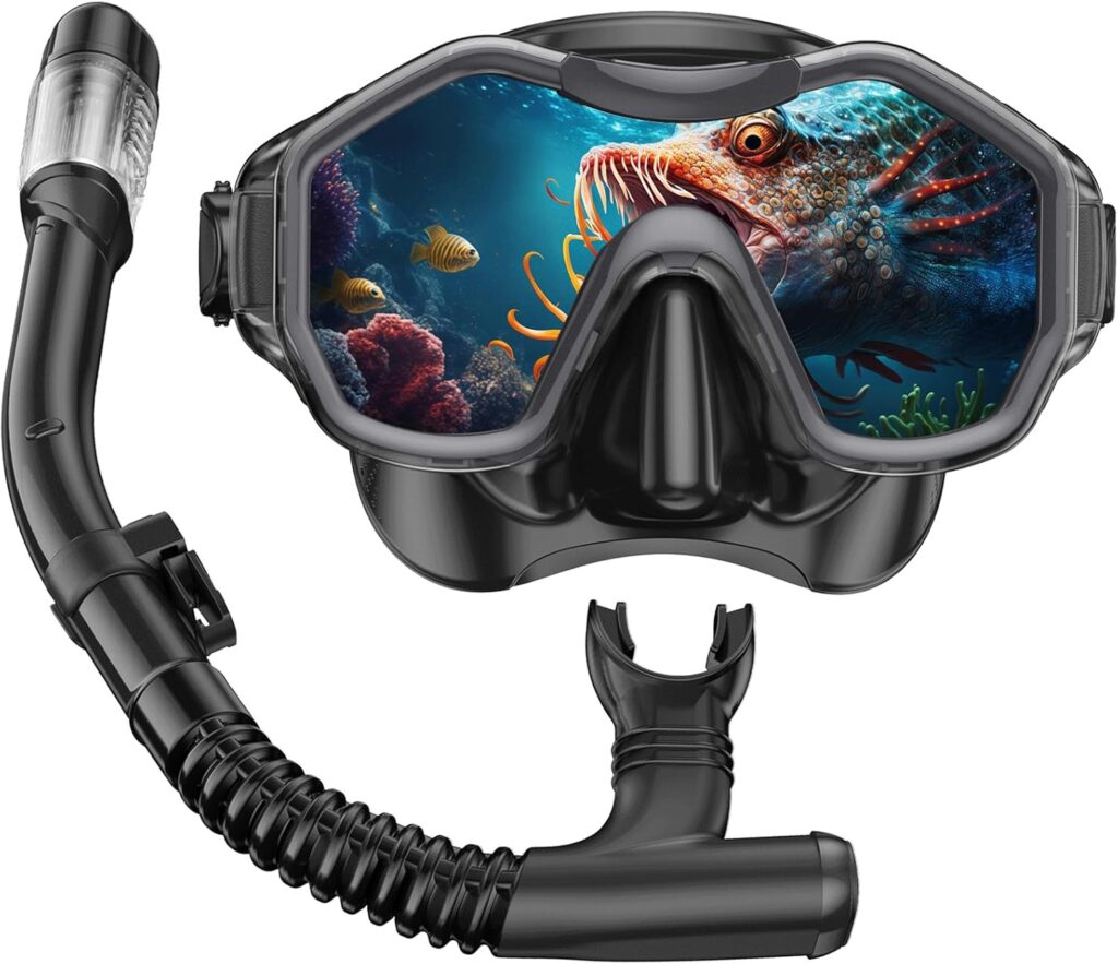 Diseño gran angular de vidrio templado reforzado y tratamiento antivaho que reduce el empañamiento. El borde de silicona suave se adapta perfectamente al rostro sin dejar huecos para evitar la entrada de agua. Este snorkel superior para adultos tiene una válvula de natación en la parte superior del tubo de respiración que sella completamente al bucear para evitar que entre agua y se abre para facilitar la respiración sobre el agua.