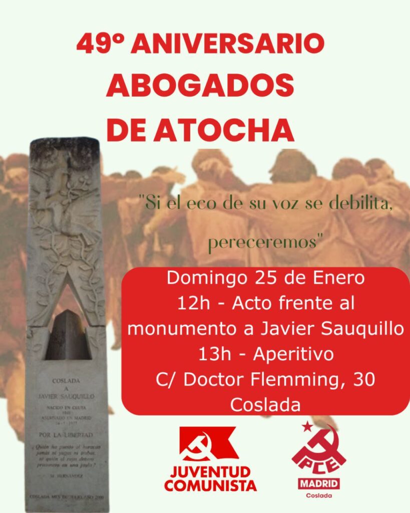 Hay fechas que no se borran del calendario colectivo. No por costumbre, sino por memoria. Cada mes de enero, el recuerdo de los abogados de Atocha vuelve a ocupar un lugar central en la historia democrática del país y también en la memoria de Coslada.